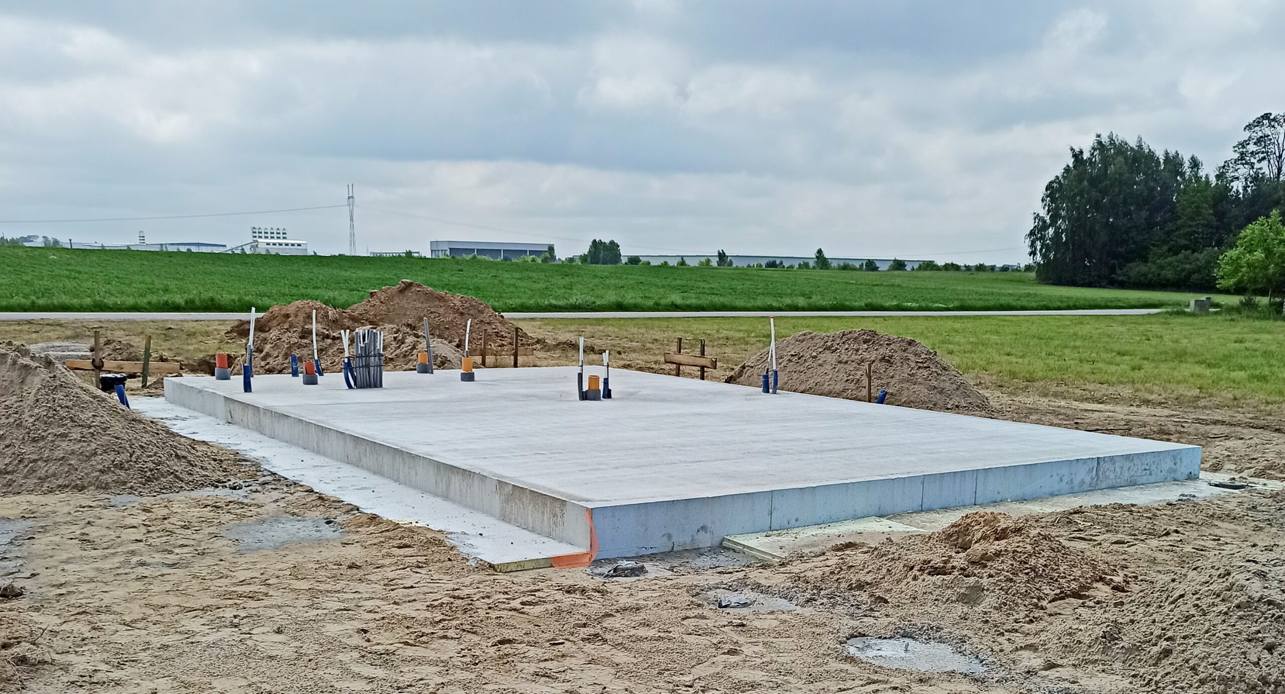 Ważne: wymiary i rozmieszczenie kotew/śrub fundamentowych muszą ściśle odpowiadać projektowi konstrukcji szkieletowej. Dlatego współpraca między wykonawcą fundamentu a dostawcą domu musi być dobrze skoordynowana — dostarczamy komplet dokumentacji technicznej dla fundamentu.