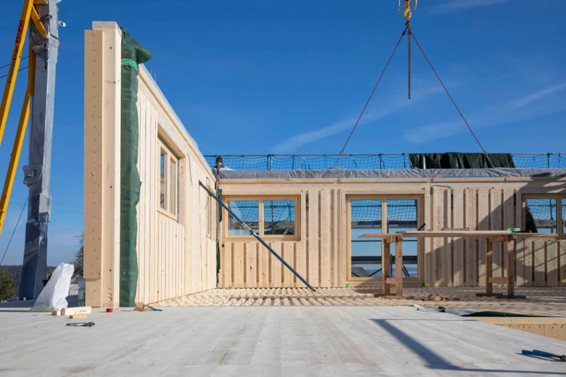 Skandynawska: panele ścienne produkowane w hali fabrycznej o kontrolowanej wilgotności i temperaturze. Drewno nigdy nie jest narażone na opady. Montaż na budowie trwa dni, nie tygodnie — dom zamyka się w stan surowy w ciągu kilku dni od dostawy.